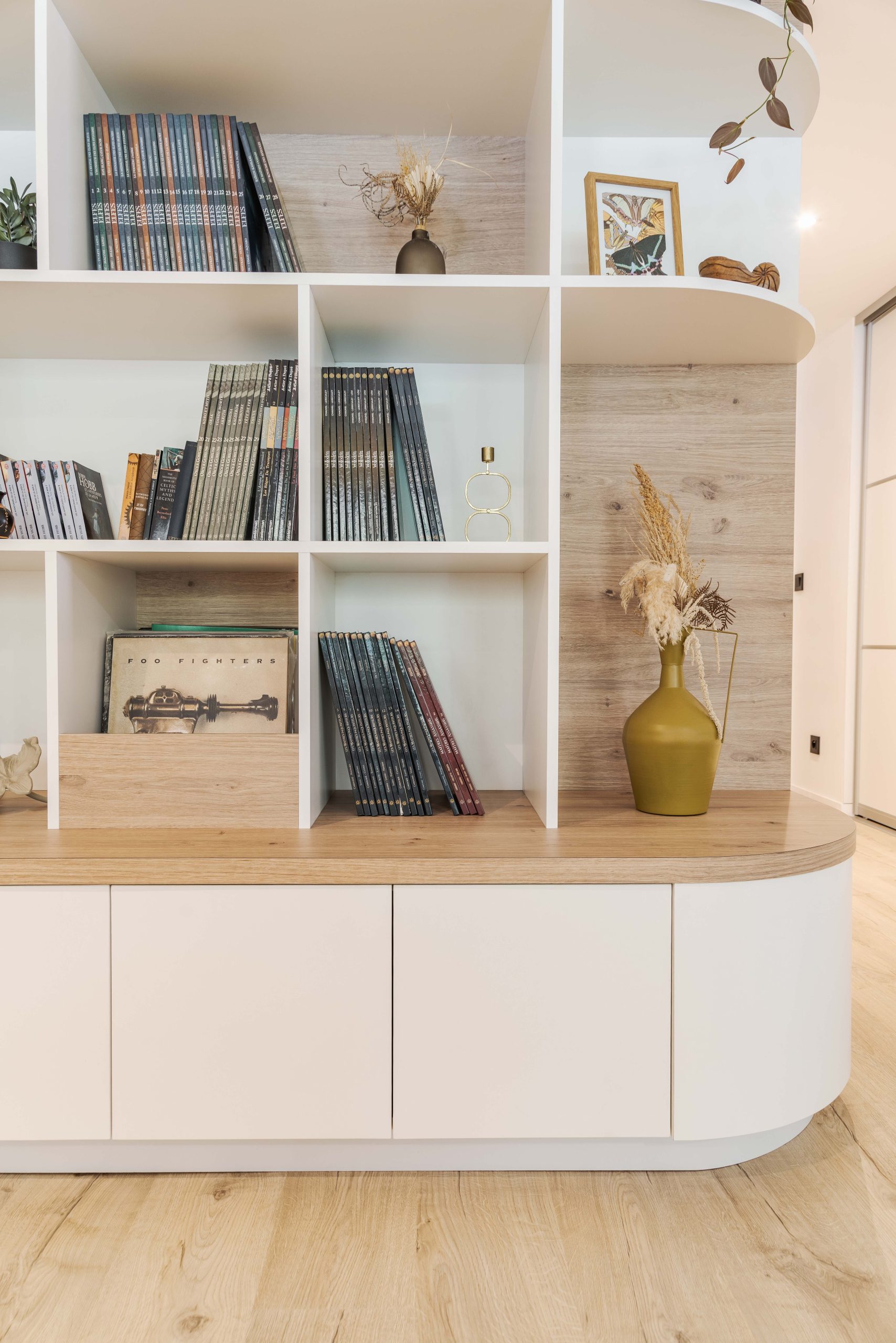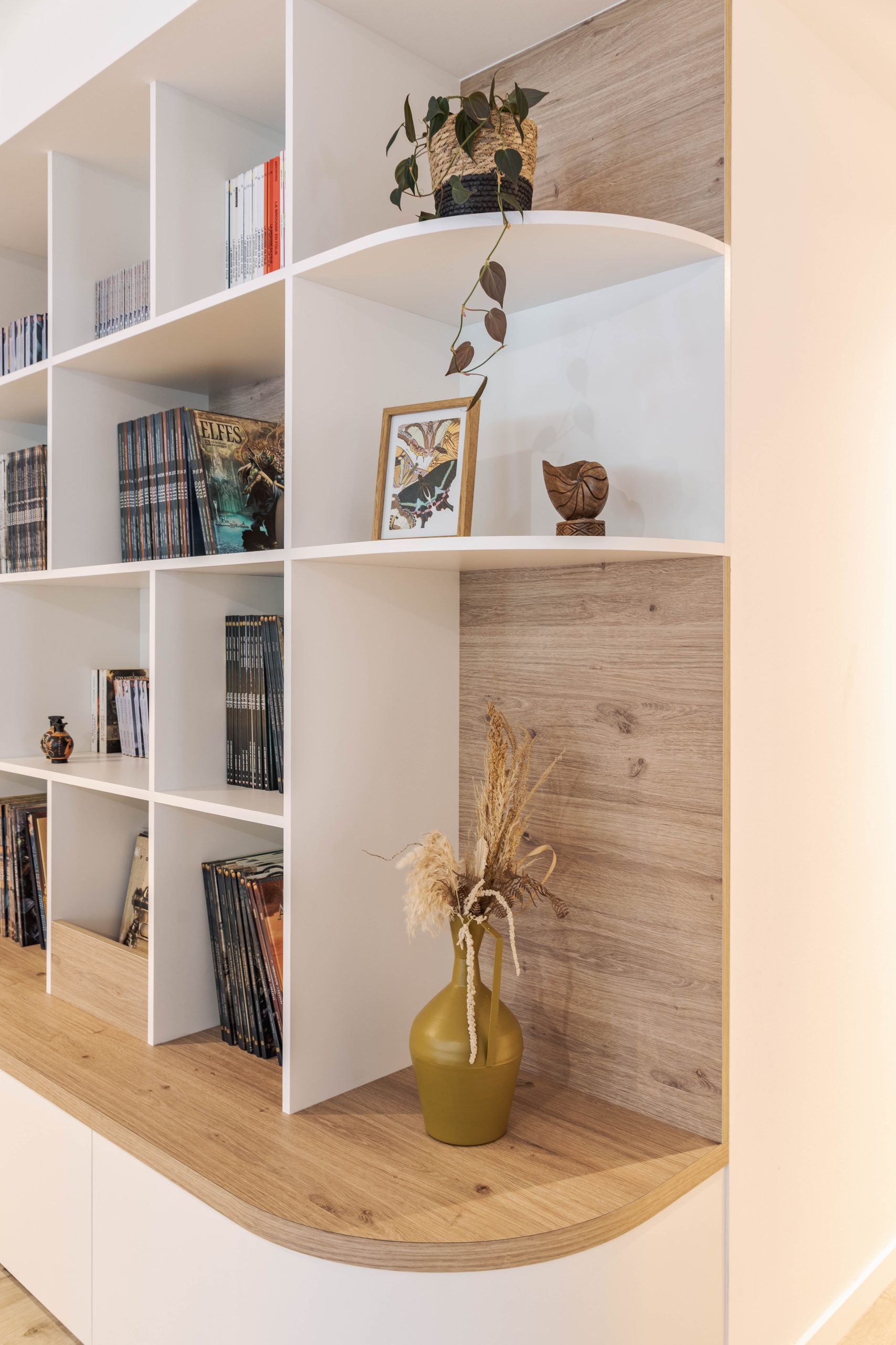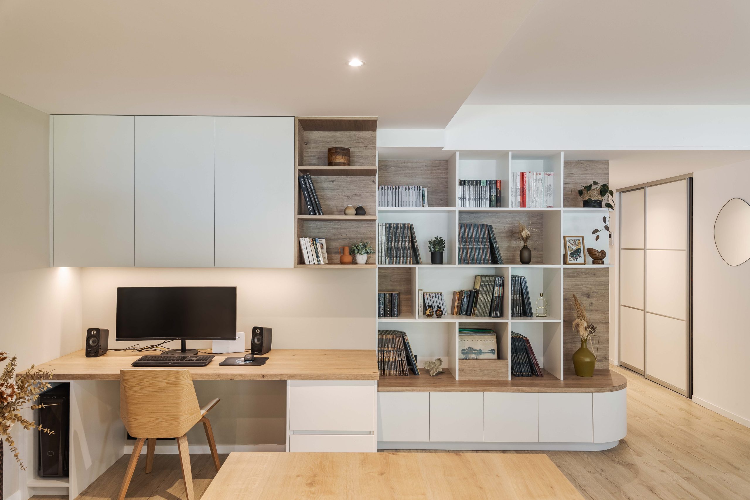 Aménagements sur mesure d’un bureau et d’une bibliothèque pour un appartement à Nouméa.