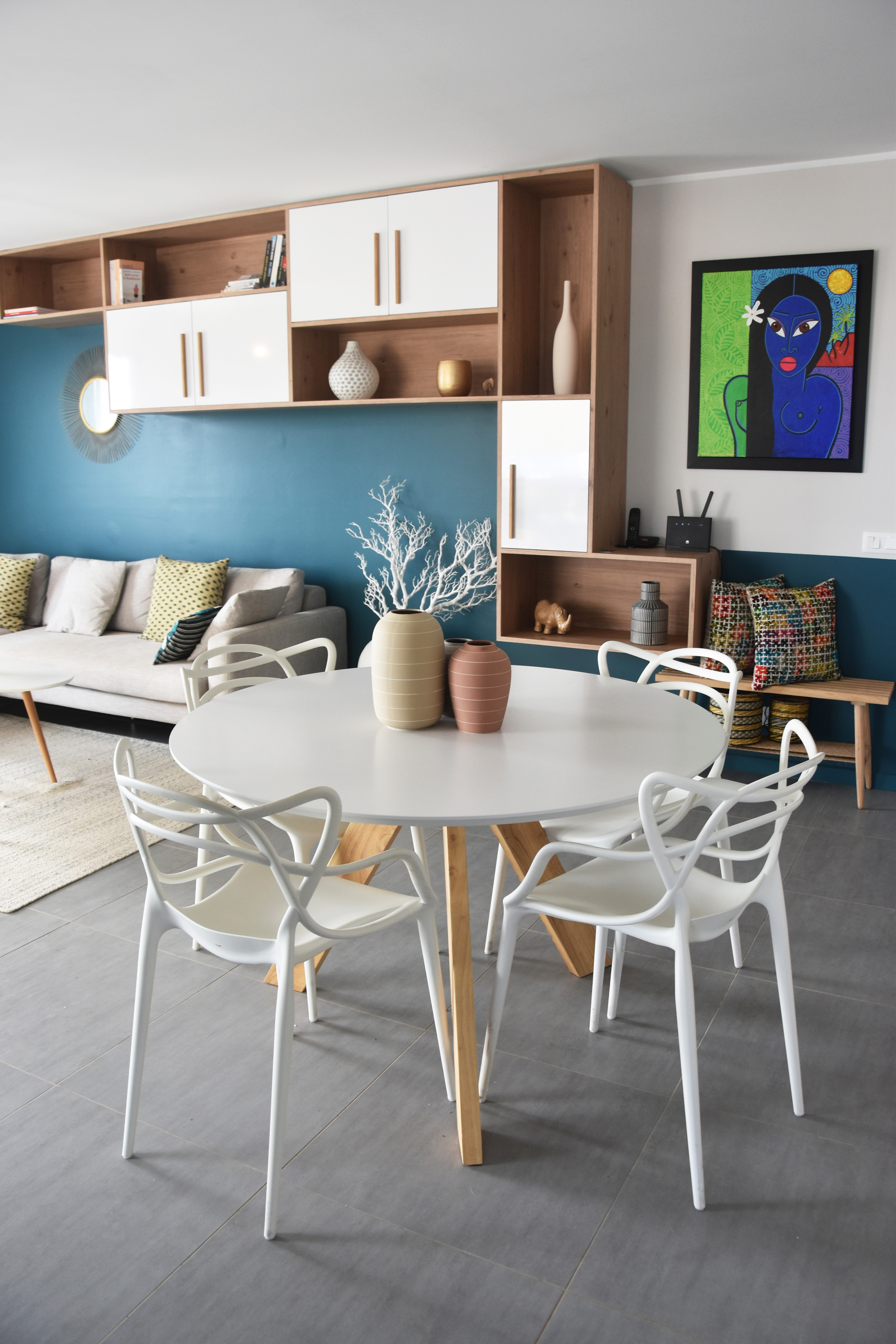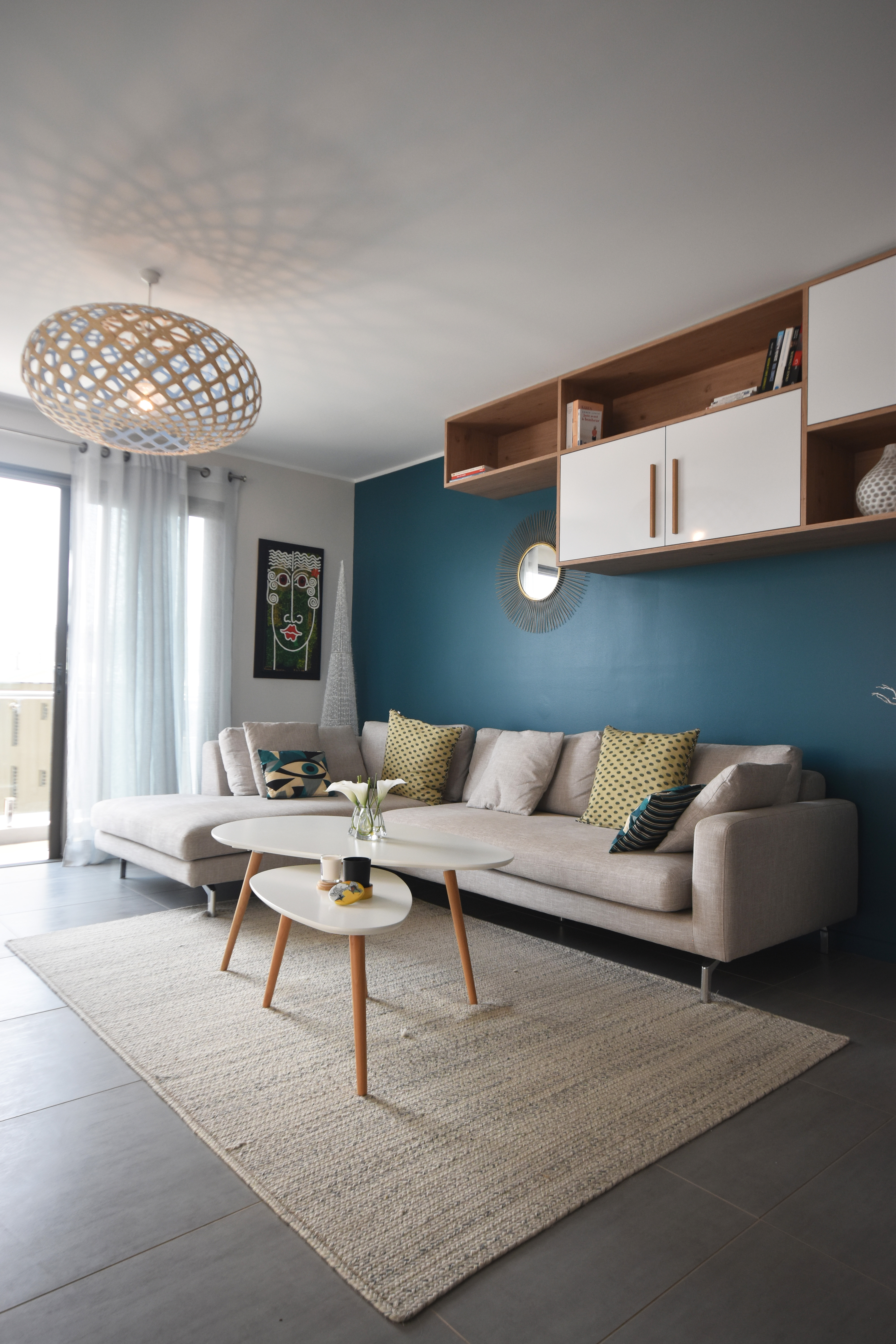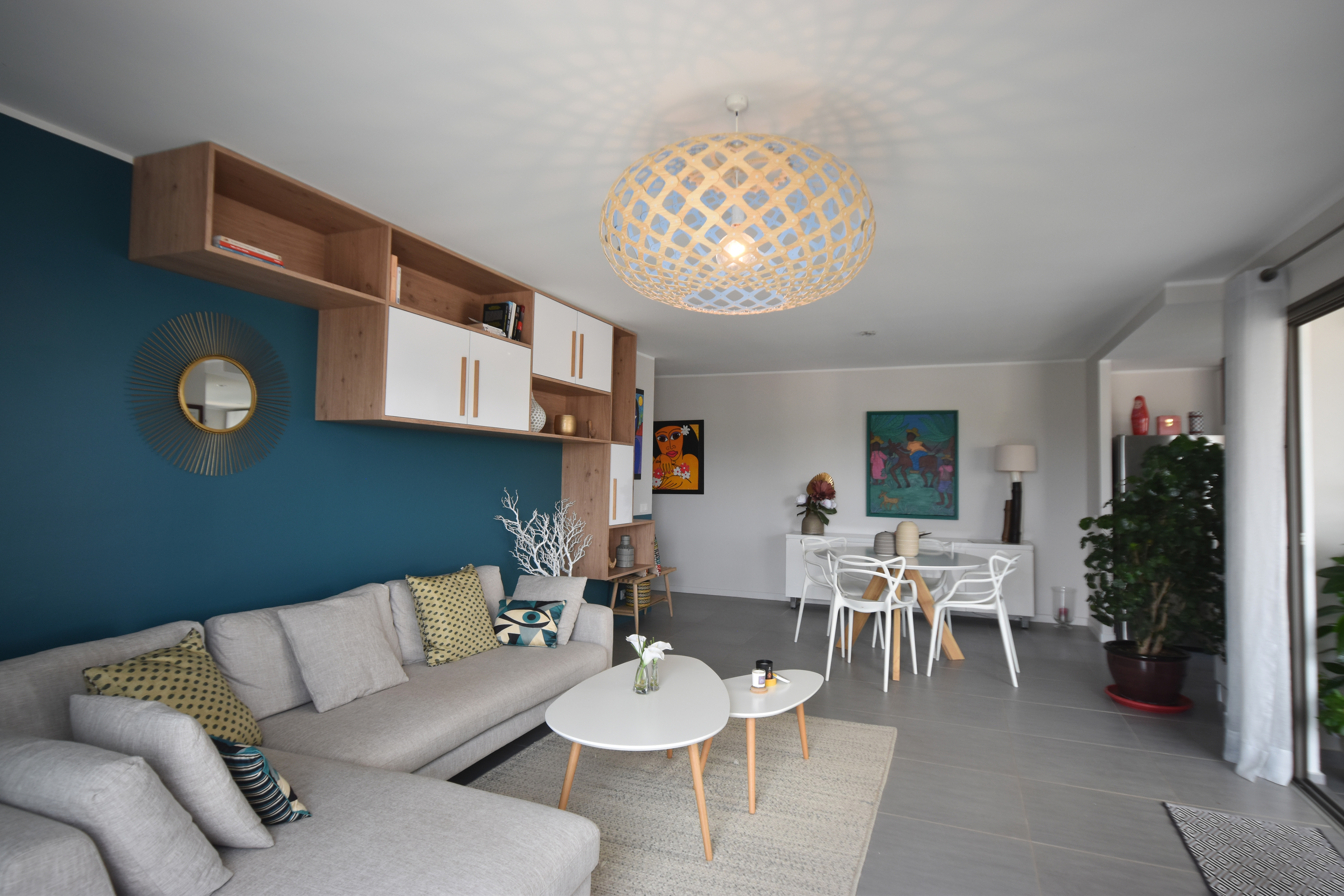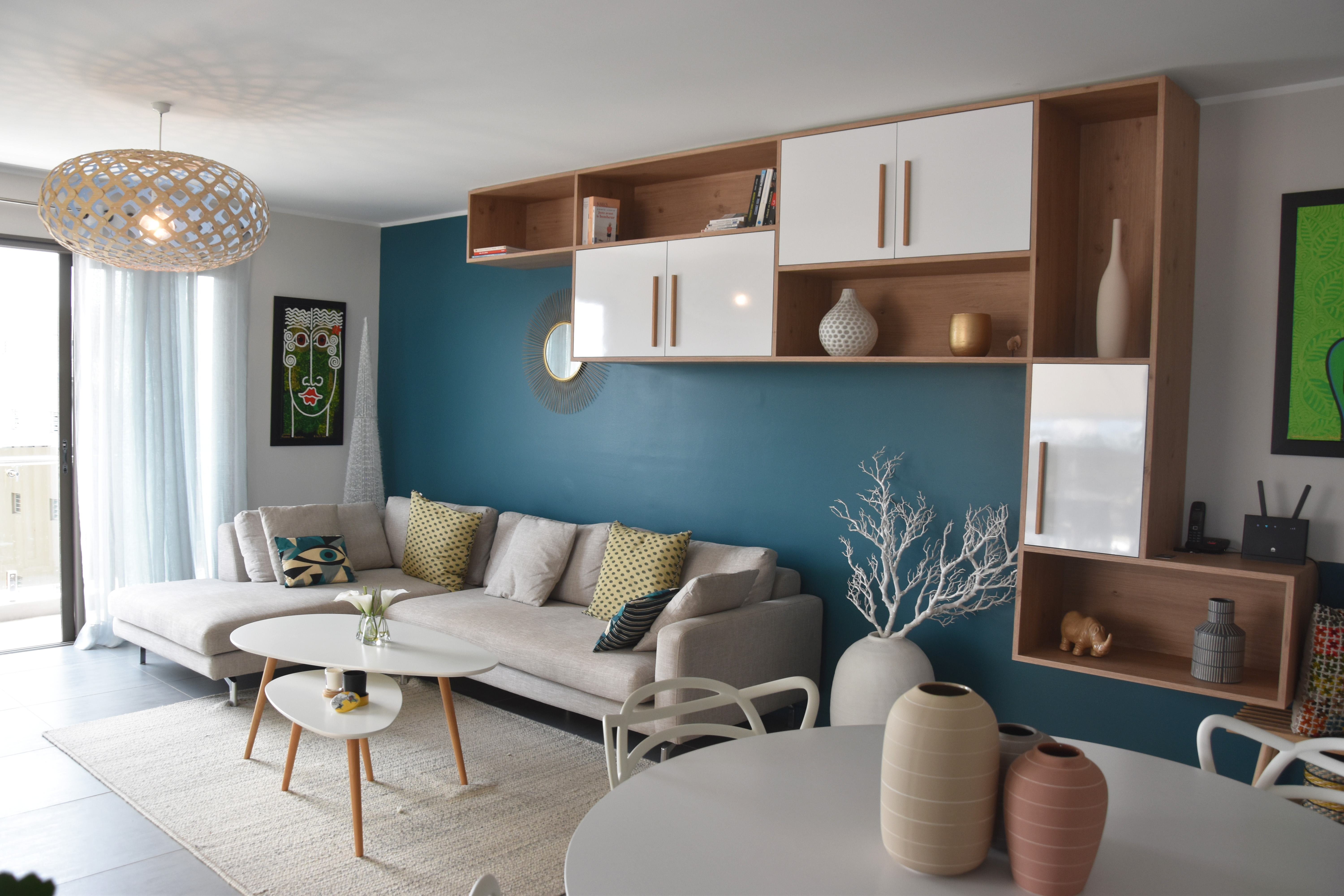 Aménagement, ameublement et décoration du séjour et des 2 chambres d’un appartement récent sur Nouméa. Le grand meuble bibliothèque ainsi que le meuble TV ont été dessinés et réalisés avec talent par nos menuisiers.