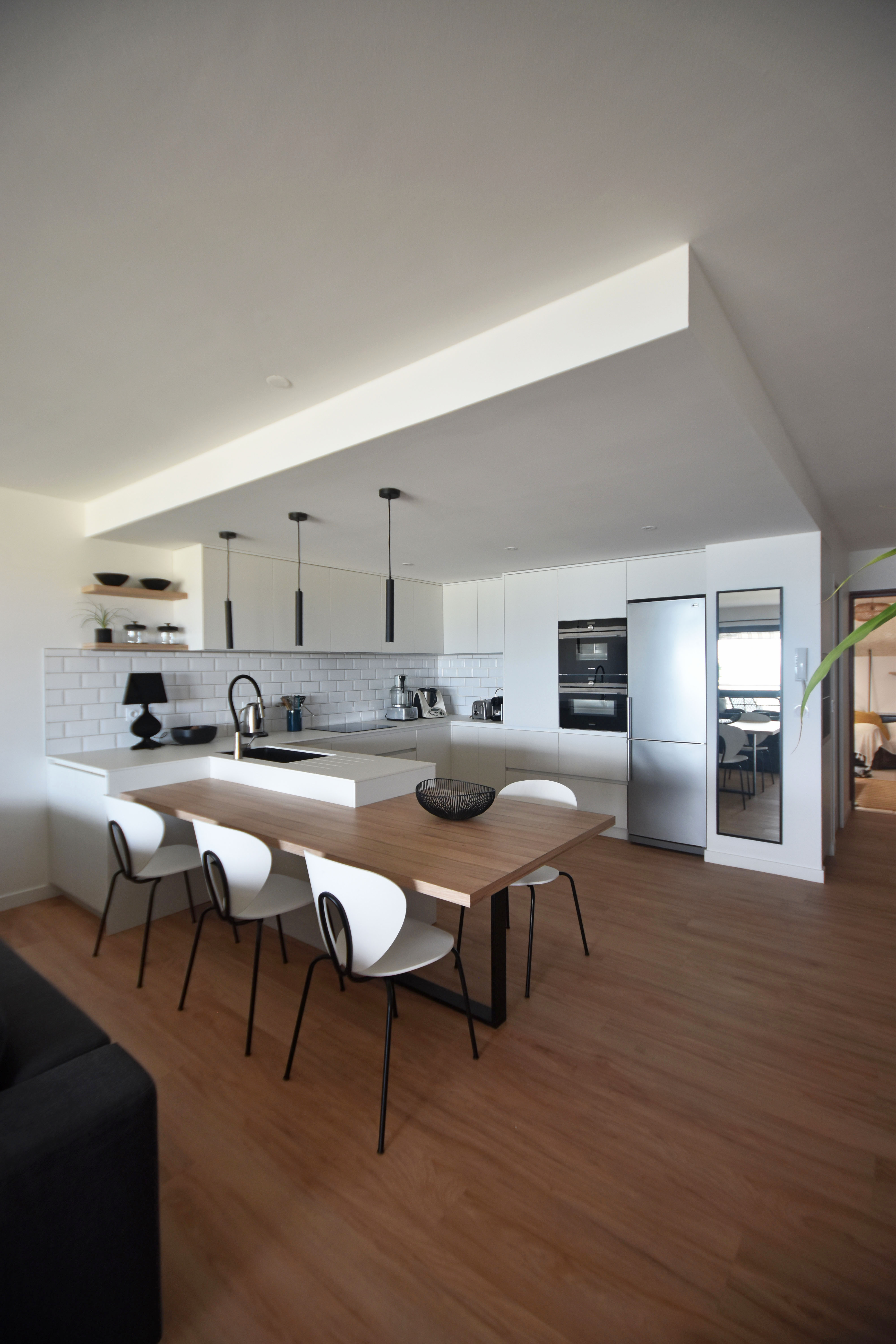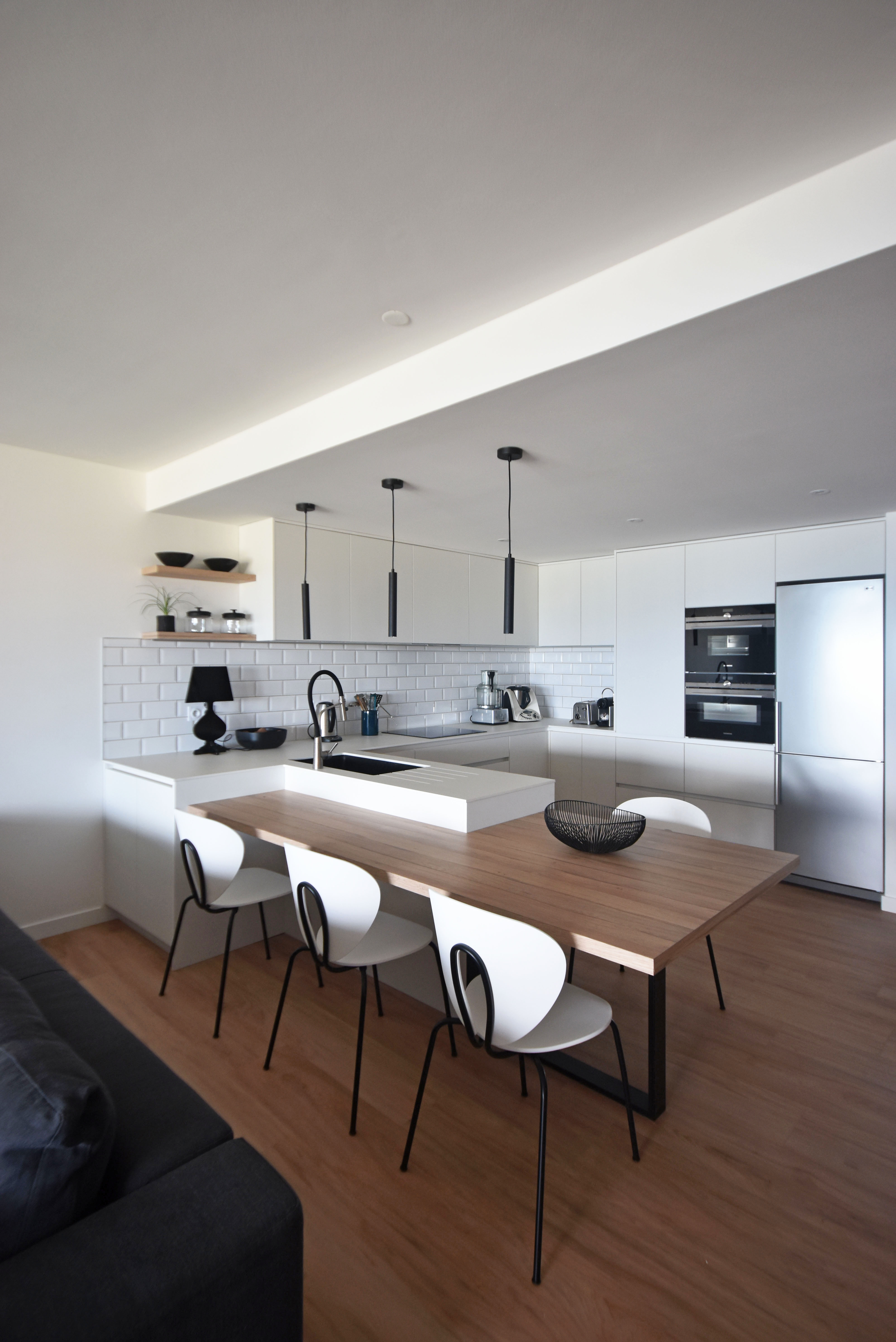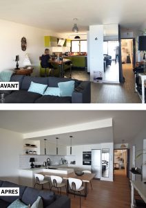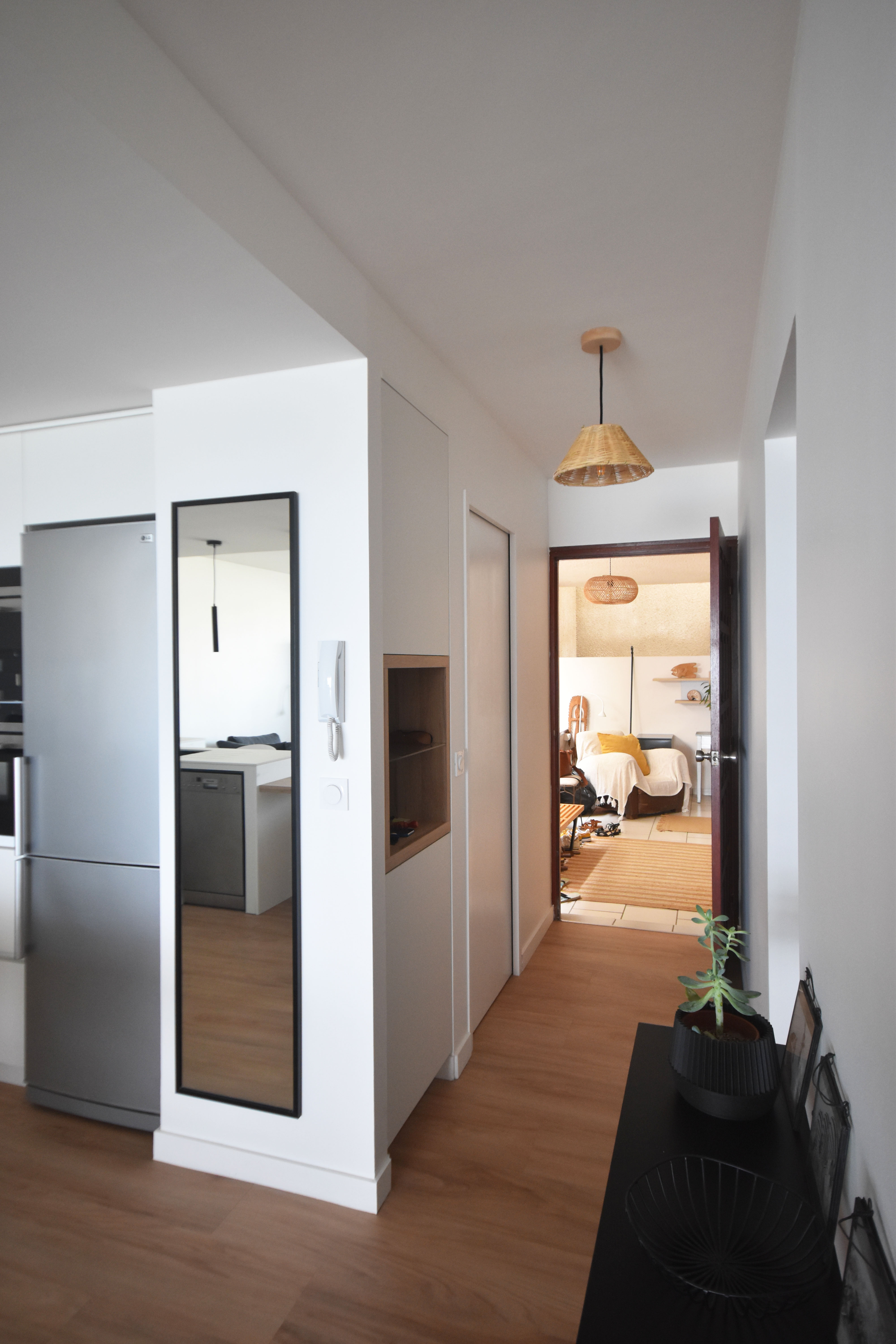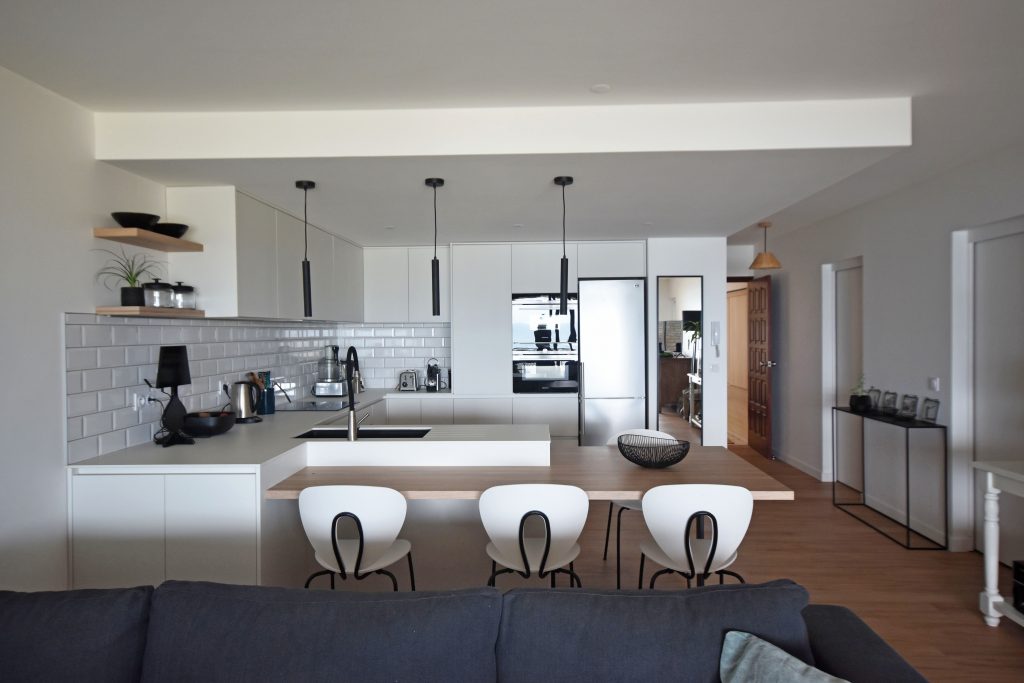 Rénovation partielle du séjour de bel appartement. Nous avons rénové et réaménagé la cuisine, l’espace buanderie et créé une entrée avec rangement.